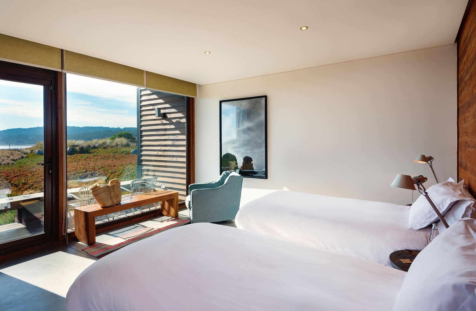Las habitaciones están decoradas con minimalismo rústico, con pisos de concreto pulido y paredes de madera que se adaptan fácilmente al paisaje, manteniendo el enfoque en las amplias vistas del Pacífico. La mayoría de los huéspedes pasan sus días en el océano, pero otras diversiones incluyen clases de yoga, jacuzzis a leña y un restaurante que solo sirve comida y buen vino proveniente de dentro de los 100 kilómetros del hotel.